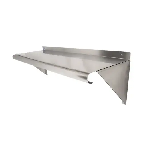 This commercial wall shelf includes 18-gauge 430 stainless steel construction with #4 finish. The matte finish eliminates glossy sheen.