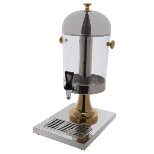 The Update International JD-22GD - Stainless Steel - Juice Dispenser - 24.02" x 10" x 13.78" is an important item to keep in every restaurant establishment that serves all juices and chilled non-carbonated beverages. This Juice Dispenser is made of bright and durable stainless steel with gold-plated accents. Acrylic juice container with ice core center. Features removable beverage container and drip tray make clean up quick and easy.