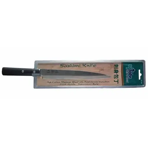 The Update International JK-05 - Stainless Steel - Sashimi Knife is an important item to keep in every restaurant establishment that needs to slice and cut large pieces of fish. This Stainless Steel Sashimi Knife is made of high-carbon stainless steel with molybdenum vanadium for increased flexibility and a POM handle that resists corrosion. Pointed blade tip with straight edge. Measures 8-1/4-inch blade length by 13-inch overall length.