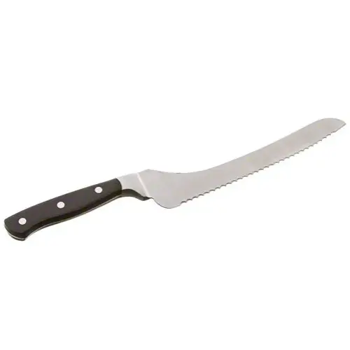 The Update International KGE-12 - Stainless Steel - Bread Knife - 0.5" x 4" x 14.25" is an important item to keep in every restaurant establishment that needs to slice bread. This Bread Knife is made of high-carbon stainless steel with molybdenum vanadium. The handle of the knife is made from durable, slip-resistant POM and has a contoured shape to better fit your hand. Hand-honed knife has pointed blade tip with straight edge. Measures 14-1/4-inch overall length 9-inch blade length.