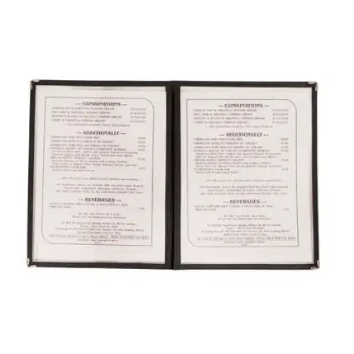 The Update International MCV-2BK - Double Fold - Menu Cover - 0.1" x 9.25" x 12" is an important item to keep in every restaurant establishment that needs to protect Menu Cards from getting wet, stained, torn, and even burnt. This Double Fold Menu Cover is made with a durable transparent plastic so that customers can clearly survey their options. The plastic is also easy to wipe down. Attractive black binding helps keep these menu covers together.