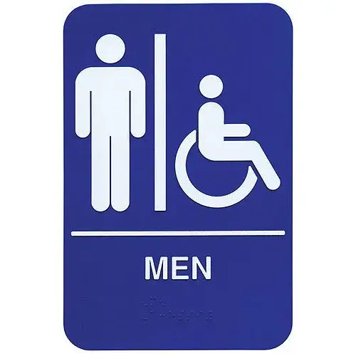 The Update International S69B-2BL Braille Sign Board, Men/Accessible, White on Blue 9" X 0.13" X 6" is an important item to keep in every restaurant establishment that requires a sign that clearly displays the location of handicap-accessible mens restrooms.