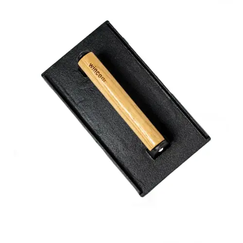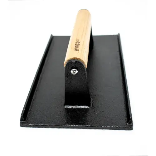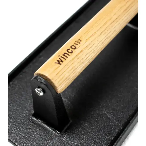 This Winco 4SWA-9 cast iron steak weight 9" x 5-1 is perfect for your restaurant establishment. Contribute to a perfectly cooked steak with this weight. The purpose of a steak weight is to properly and evenly cook meat. This item has a heat resistant base and a wooden handle.Winco Specs